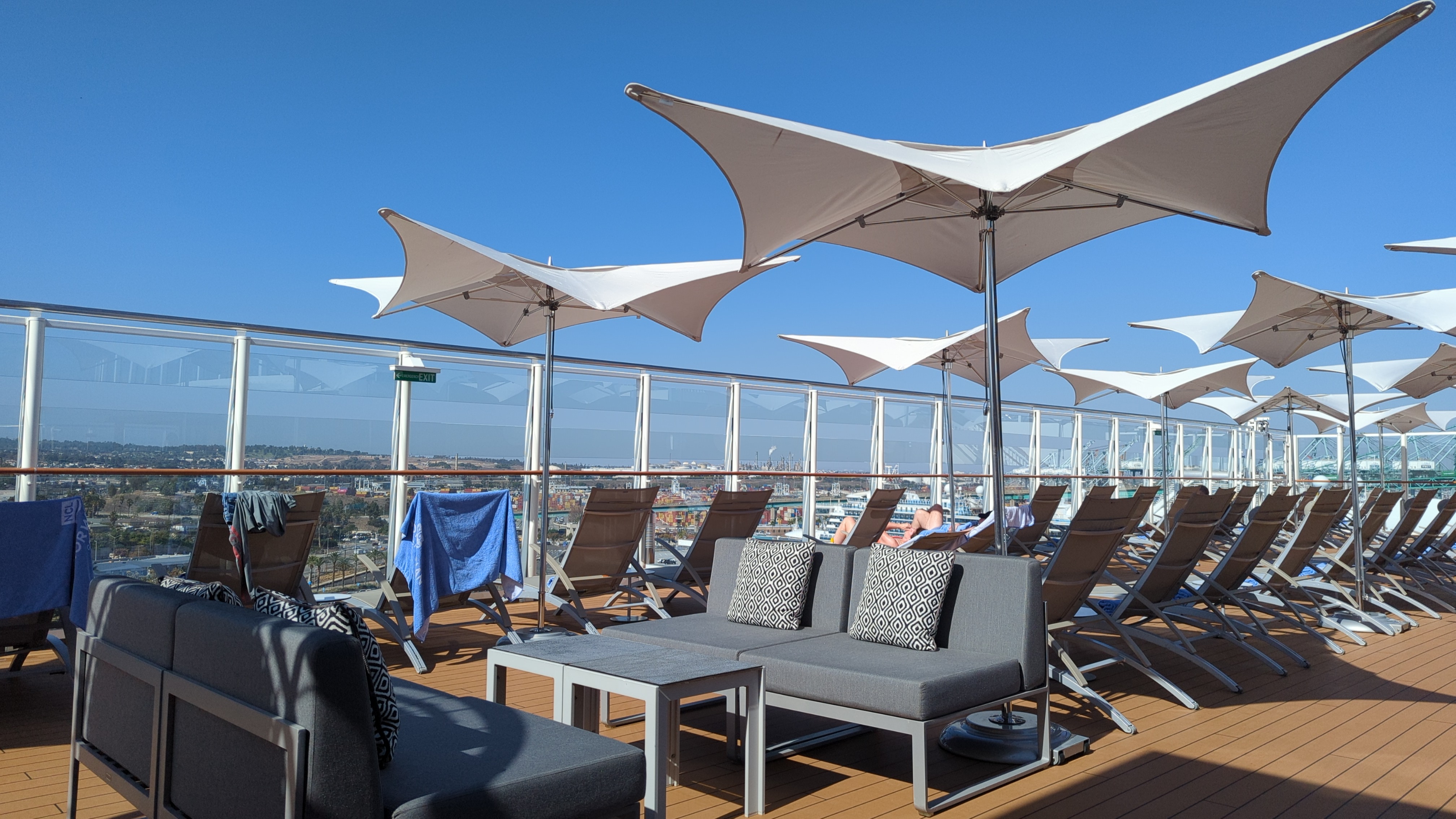 I’m writing this from my lounge chair in the Vibe. Think of it as the Observation Lounge, outdoors, at the very top of the ship. With everything going on and the temperature not being truly warm until today, it’s the first time we’ve been up here.