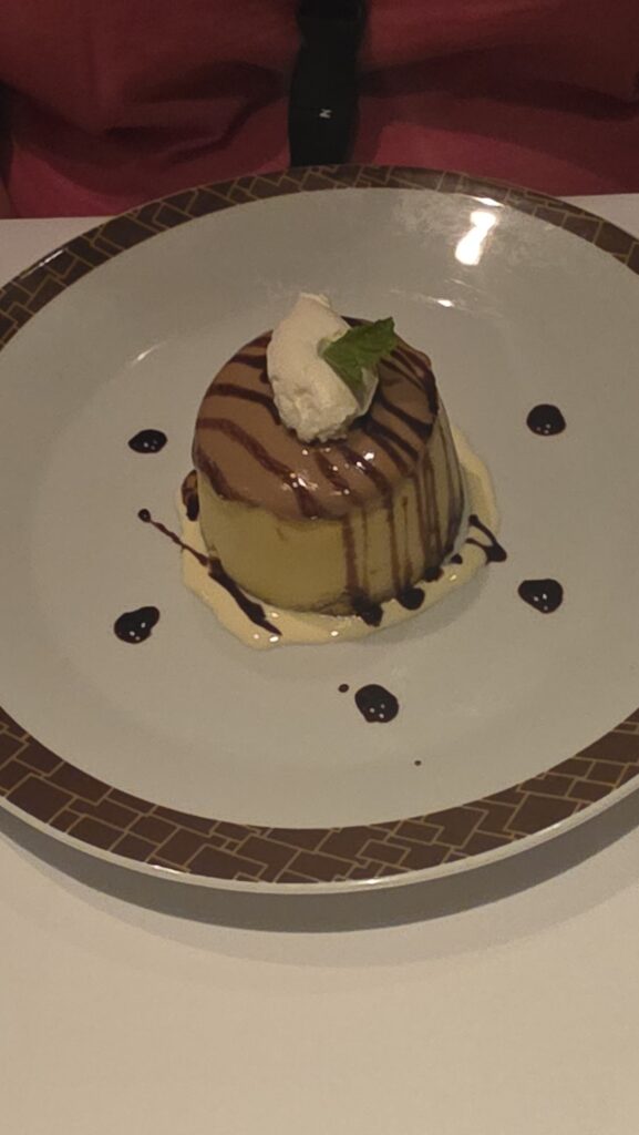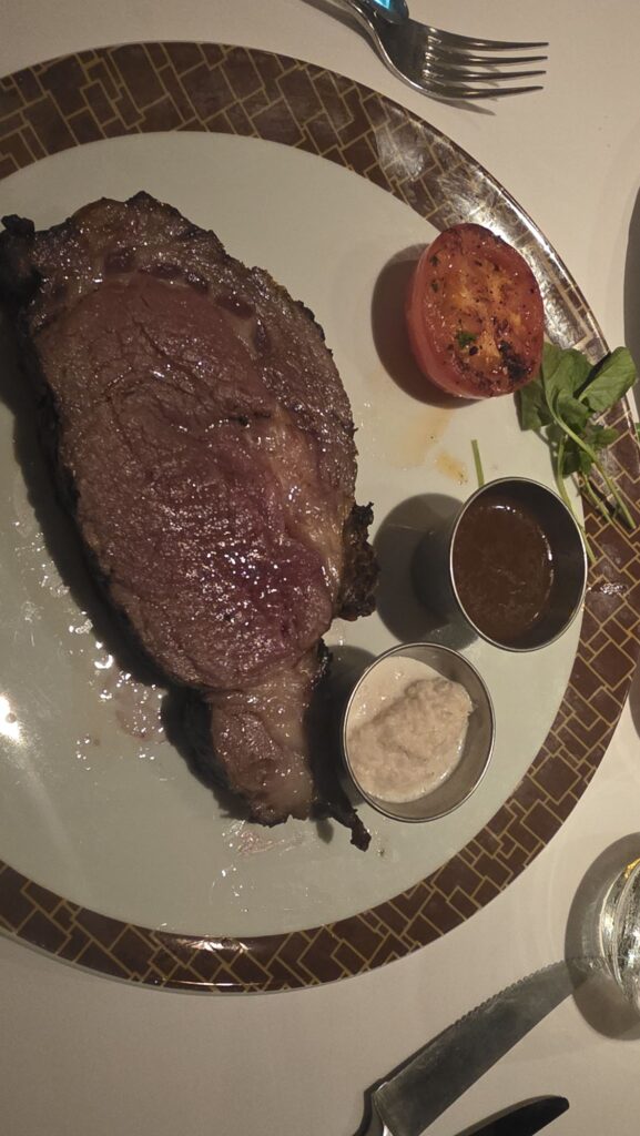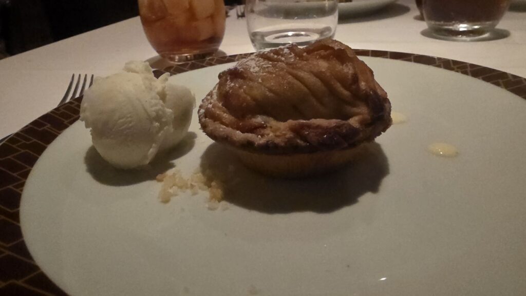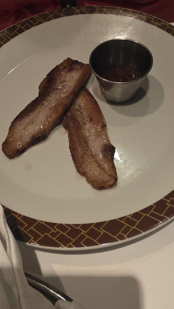 The thick-cut bacon was a surprise. I think it’s because of it being different from what we are used to — no added maple flavor or other flavoring. This was just grilled thick cut pork, nothing more or less. Reasonably tasty, yet a bit short of expectation. I think this one is on us, though, not NCL…we didn’t know what to expect.